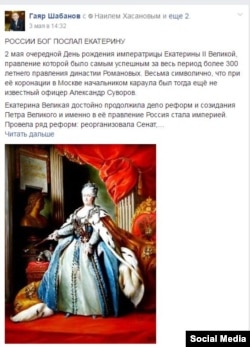 Әби-патшага (Екатерина II) Казанда һәйкәл кую-куймау мәсьәләсе куера. Дөнья татар яшьләре форумының әлеге һәйкәл өчен үткәрелә торган бәйгене туктануы сорап 5 майда Казан хакимиятенә язган үтенече җавапсыз кала. Ул арада социаль челтәрдә билгеле кешеләр имзалаганын күрсәтеп Әби-патшага мәдһия хатлары таратыла. Фейсбукта "Tatarlar Deutschland" төркемендә Гаяр Шабанов "России бог послал Екатерину" дигән язма урнаштырды.