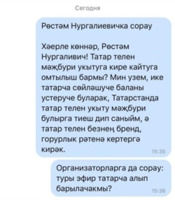 Җанлы эфир язмасы астында татар теленә караган сораулар да булды. Татар теленең мәҗбүри укытылудан туктатылуы, татар мәктәпләре торышы темаларына сораулар бирелде, әмма аларның берсе дә эфирда яңгырамады.