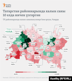 2021 ел җанисәбе шуны күрсәтте: халык Татарстанның авыл районнарыннан йә зур шәһәрләргә, йә зур шәһәр янындагы районнарга күченә. 10 елда Казан тирәсендә урнашкан Питрәч районында халык саны 113 процентка, Лаешта — 69%, Биектауда — 30%, Чаллыны чолгап алган Тукай районында — 28%, Әлмәттә 8 процентка артты. Бу районнарда эш булуы, халыкның кереме югары булуы белән бәйле.