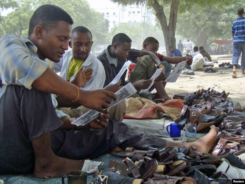 Сомалида футбол җанатарлары бер күз белән матч караганда, икенчесе белән динче төркемнәр килеп кермәсен дип ишекне күзәтеп утыра.