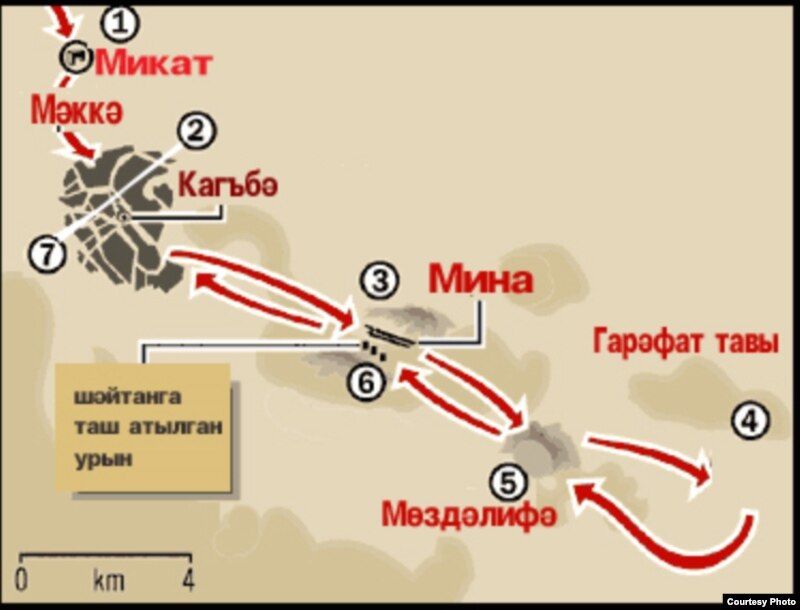 Гарәфәт тавы, Мөздәлифә һәм Мина арасында билгеле бер чик юк. Минада хаҗи булачак кешеләр шайтанга таш ыргыта. Беренче көн шайтанга таш ыргыткан һәм корбан чалган мөселманнар ахырда кырынып хаҗи була.